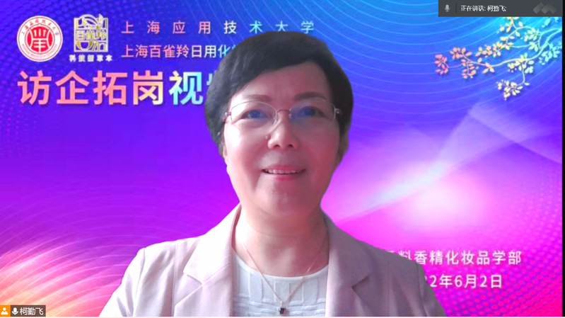 柯勤飞代表学校对百雀羚参会人员表示感谢和问候,并介绍了学校发展定位和近期成果。她指出,学校始终坚持“应用导向、技术创新”的特色定位,秉承“依产业而兴、托科技而强”的办学理念,近几年在科研、教学和学科建设等领域取得佳绩。香料香精化妆品是学校的特色优势学科,与百雀羚在毕业生就业和科研成果转化方面合作紧密,双方共建有学生实习基地和产学研基地,希望此次视频会议能够在上海全面恢复生产生活秩序的背景下,进一步促进毕业生就业、深化产学研合作,更好落实上海市委市政府提出的扩大就业、重振经济目标。
